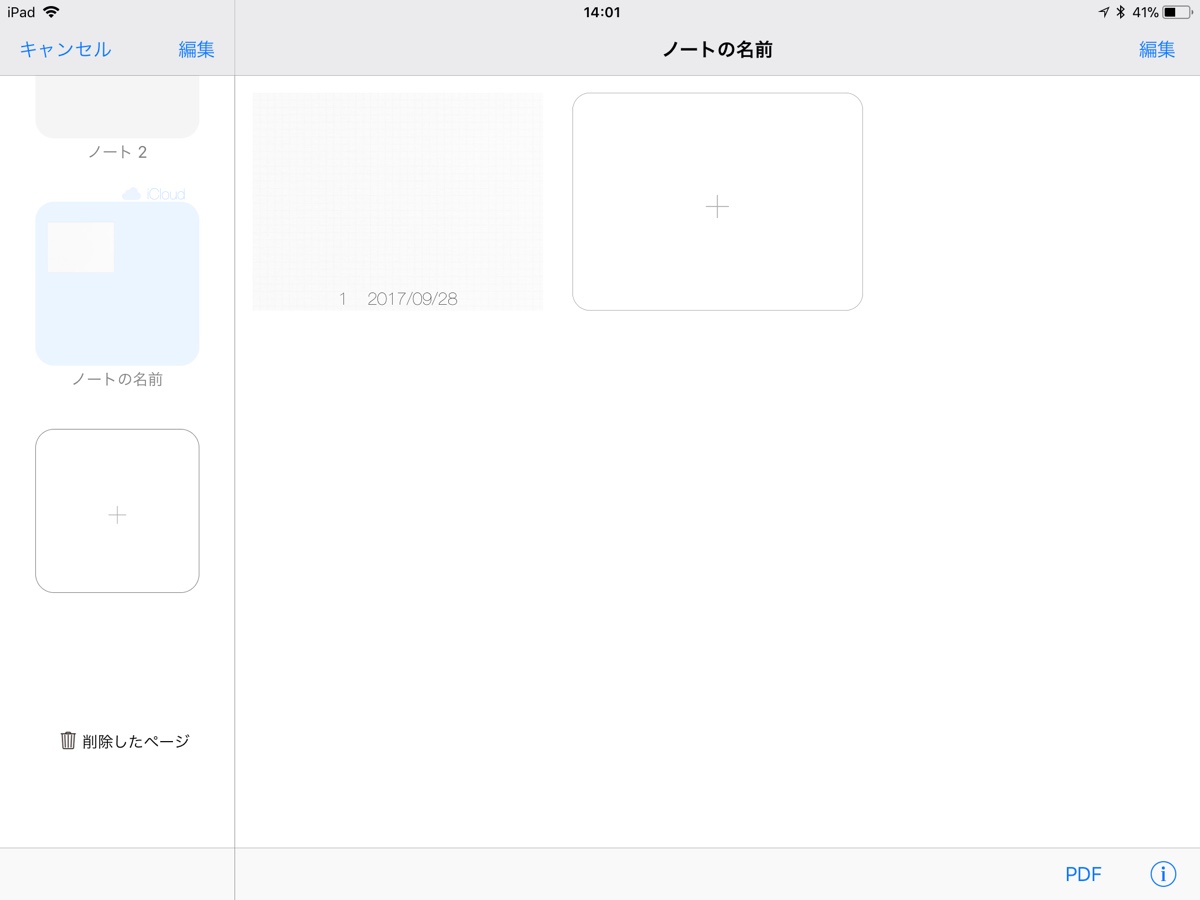 ノート一覧のプラスボタンをタップするとノートをiPad内かiCloud内に作成できます。