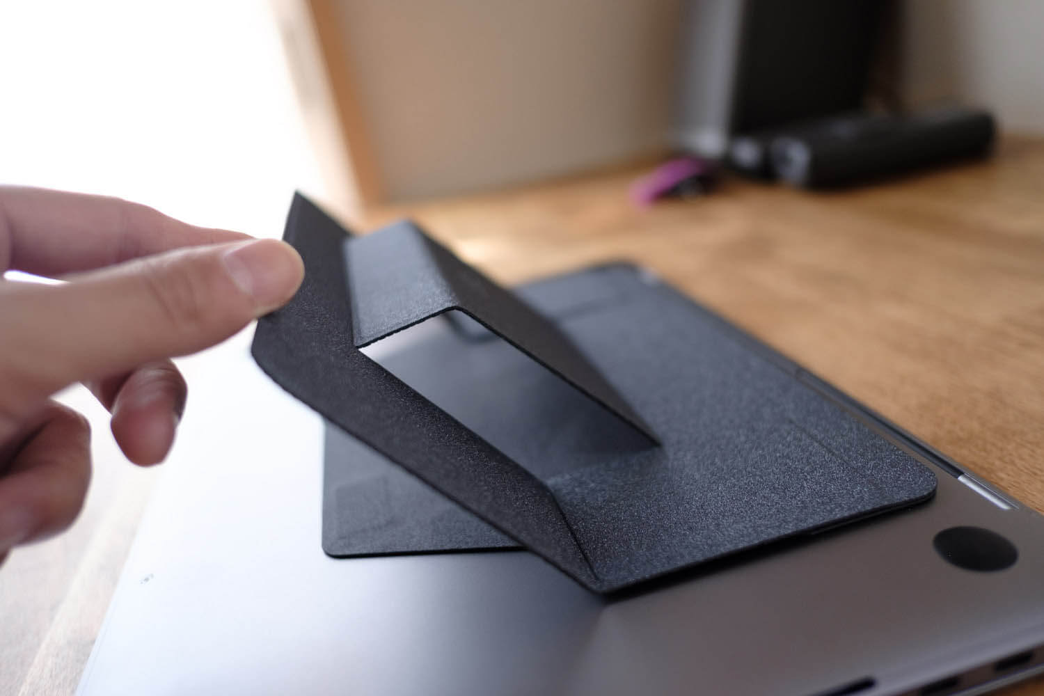 MOFTは従来のPCスタンドとは一線を画していて、折り目の入った一枚板の外観が特徴的。実際に持ってみると見た目以上に薄くて軽い印象です。